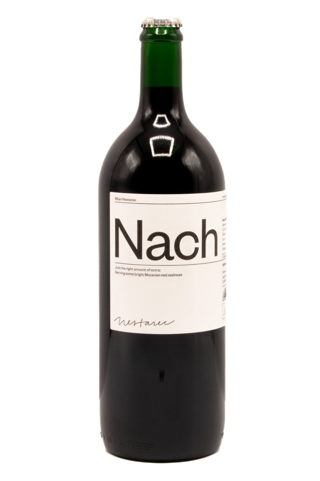 Nach je návrat do dětství: Milan je odkojený jejich lokálním červeným, takovým typickým selským, co se u Milana na Moravě pilo, než se začaly řešit barikové sudy, odbourávání kyselin, hladkost, taniny a jiné výdobytky, zastírající charakter místa. Ale Milan chtěl vrátit slávu šťavnatému moravskému červenému vínu na každodenní pití, založenému na naší milované Frankovce. Takže Nach. Odvozeno od staročeského názvu pro barvu, kterou toto víno má.